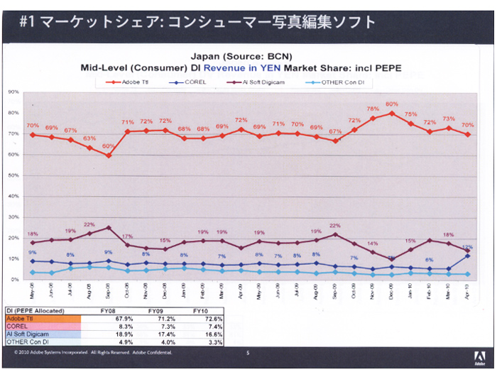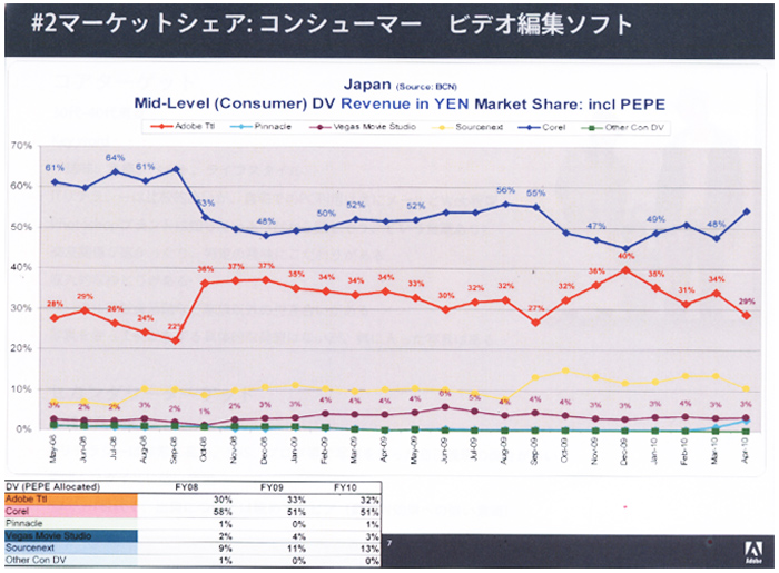 一方、ビデオ編集ソフト分野では、強力なライバルであるコーレルのシェアが高い。国内では「Movie Writer」「DVD Writer」「Video Studio」などの製品でULEAD社が実績を上げてきた。そして、コーレル社の買収と事業統合に伴い、ユーリード社のユーザを獲得したコーレルが市場で高いシェアを持つことになった。アドビは定評のあるプロユースの「Premire CS5」の弟分である「Premire Elements 9」をPhotoshop Elements 9 との組み合わせで普及促進し、シェアを一気に獲得したい考えもあるだろう。